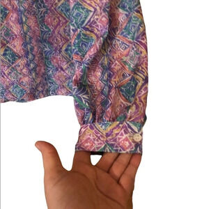 Pastel purples blue , pink , lavender. Retro blouse circa 1980 .