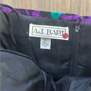 RARE stunning strapless sheath dress by A.J. Bari showcases a vibrant purple, red and orange floral pattern, perfect for a cocktail night out. The fitted black waistband accentuates the waist, while the knee-length skirt adds a touch of elegance. The structured bodice and straight neckline complete the sophisticated look.