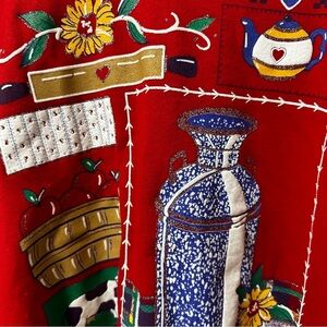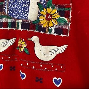 Vintage 80s red collared sweatshirt with a country motif. The front is a puffy/3-D Americana cottage design and the collar is white sigh a blue heart & cross pattern reminiscing of quilting. A great grannycore pullover!