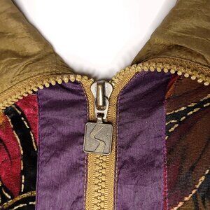 This jacket whispers tales of spirited autumn walks, its floral pattern evoking a symphony of falling leaves. Its gleaming gold shell, accented by bold purple stripes, captures the audacious spirit of the 80s with an artistic flair. A timeless piece for those who embrace both comfort and vibrant style.