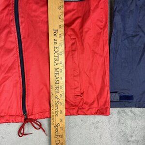 Vintage 80s Adidas Nylon Track Jacket Men's Training Full Zip Lightweight Running Long Sleeve with a reflective line around body. Red and Navy Blue, made in USA.