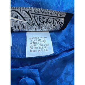 Elegant blue long-sleeve peplum top featuring a floral jacquard pattern, button-up front closure, and flattering tailored fit. Made in the USA with easy machine wash care.