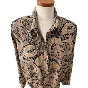 Vintage 80s Alfred Dunner brown and black paisley pull on blouse, size 14. Good preowned condition, 100% polyester. Features several buttons, collar, and ruching at waist