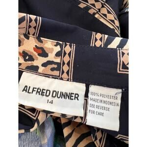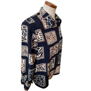 Vintage 80s Alfred Dunner animal print button down shirt, size 14. 100% polyester, Good preowned condition. Features button front, collar, long sleeves and shoulder pads.