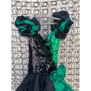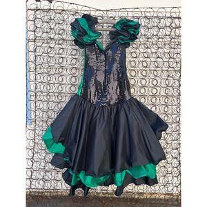 Vintage 80s Alyce Designs Green Black Sequin Ruffle Prom Ball Gown Mardi Gras