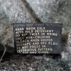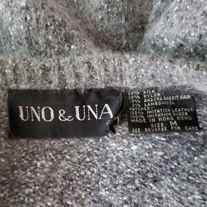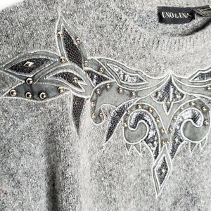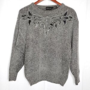 Uno & Una Vintage 80s Angora Silk Pullover Sweater M Faux Leather Leaf Flame Applique Gray