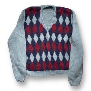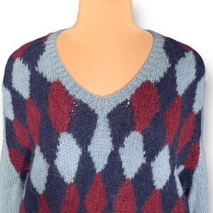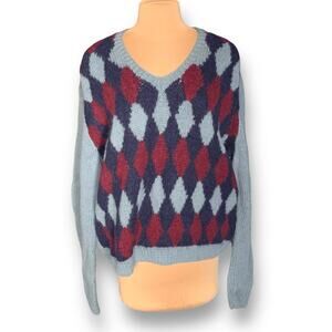 Vintage 80s Argyle Sweater V Neck Blue Burgundy Navy Diamond Knit