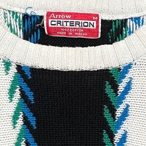 Add a pop of retro charm to your wardrobe with this vintage Arrow Criterion men’s sweater. Made from 100% cotton, this bold pullover features alternating black and white vertical panels accented with striking chevron-style stripes in blue and green. The heavyweight knit and eye-catching colorway make it perfect for layering or wearing solo on cool days.
