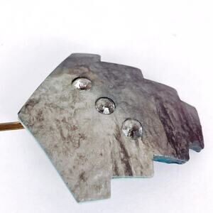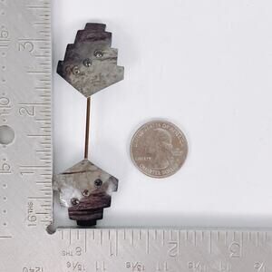 Features: Geometric mirrored ends; stepped Art Deco–inspired design; marbled gray resin surface; teal and aqua reverse side; inset rhinestones; double-ended bar brooch / collar pin format; gold tone pin stem