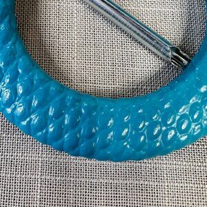 This super rad belt or scarf buckle is from the 1970s or 1980s, made in West Germany by ASTOR. A high-quality and reliable accessories company, this piece is still in excellent condition. No visible defects front or back. It has a great teal/ turquoise blue color with a slightly puffy quilted texture. Best used for a scarf or sash, it brings a great pop of color! It measures about 2" in diameter, and has a single metal piece through the middle for creating stability.