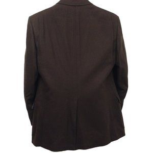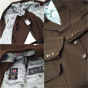 Vintage 80s Suiting Jacket Blazer Sport Coat, Austin Reed of Regent Street made in USA for May Co., men's medium measures -38R, Lined Tailored Fitted, fine woven wool material in Solid pattern, Logo Tags Novelty, eight metal buttons and inner lining with Scottish lion/dragon heraldic motif, double-button closure, 3-Buttons cuff, 2-inner pockets, 3-outer pockets with flaps, classic notched lapel, single vent, Dry Clean Wool in dark shades of brown. In pre-owned* condition with general wear to include: mended/repaired couple pin hole/holes, several random fray spots here & there, repaired hole/fray at lapel seam - see pics for detail. Rescued Garment Salvaged Recycled Repaired Grandpa Dad Favorite Chic Classic Towne Country Vanity Fair Runway On Trend Preppy Academia Career Business Casual Coastal Suiting Street