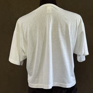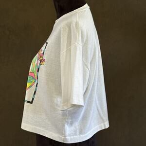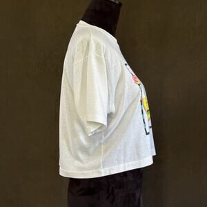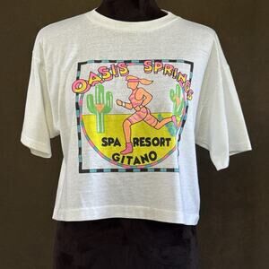 Original late ’80s/early ’90s BODY by GITANO crop tee with neon Oasis Springs Spa Resort runner graphic. Classic 50/50 heather fabric, boxy OSFA fit, Made in USA. Clean and ready to wear. Light normal vintage wear—no major flaws seen. See photos/measurements.