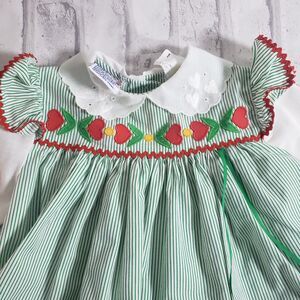 Vintage 80's Baby Girls Green Stripe Dress With Hearts