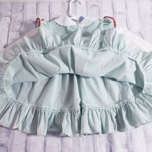 This is a charming vintage long-sleeve dress for baby girls, featuring green and white stripes, a ruffle bottom, and attached heart-shaped details with heart designs around the collar. It is in excellent condition, with no stains or holes.