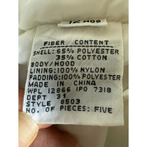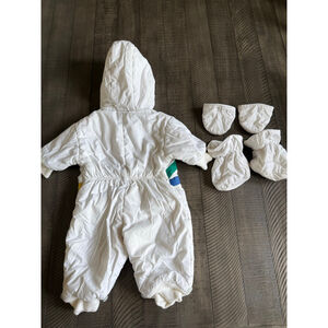 • Features: Hooded, zip front, ribbed cuffs, elastic waist, detachable mittens & booties