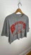 Soft heather gray cotton blend with worn red collegiate lettering and muscular football player graphic.