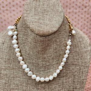 Vintage 80s Baroque Freshwater Pearl & Gold-Tone Chain Choker Necklace 16 Inches