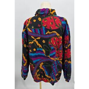 Turn heads in this bold and funky vintage bomber-style jacket featuring a wild abstract pattern in jewel tones—hot pink, gold, teal, purple, and red—on a rich black base. Made of 100% silk with a full zip front, elastic cuffs and hem, and roomy fit. Lightweight but fully lined, perfect for layering or rocking solo. A retro statement piece that screams vintage streetwear and unapologetic 80s flair.