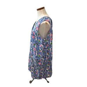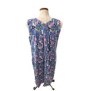 Vintage 80s Basic Editions Summer Strawberry Print Sleeveless House Dress. Good preowned condition with snap front, front pockets in a cute strawberry and floral print. Some minor wash wear evident. Fits approximately like a M/L