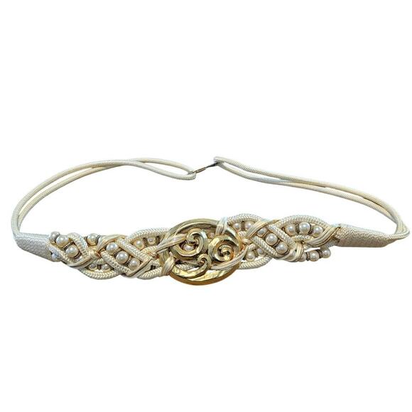 Vintage 80s Belt Women Size 1X White Gold Tone Braided Woven Glam Rock Beaded