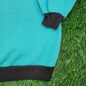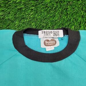 80s Bentley Fashions turquoise fleece ringer sweatshirt in women’s 2XL with black trim raglan sleeves and USA made
