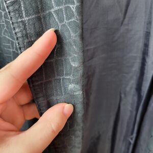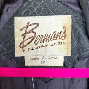 Vintage 1980s black reptile skin suede jacket by Bermans. Double breasted blazer style fit. Has two pockets at the center and front pockets. Please note, the jacket shows signs of wear throughout, but is in good wearable condition. Tagged size 38. Best fit size M. Model is 5'3 size S/M (27in waist). Please see measurements for details. PM me if you have any questions.