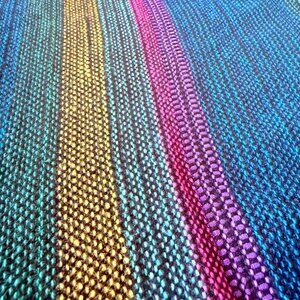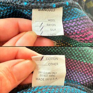 Really fun and bright and cozy vintage Cosby-style sweater here in great condition! Made in the USA! The sweater feels like cotton, but according to the tag, it is a cotton/linen/silk/rayon blend. Has a little stretch, but not a ton. Tight weave. The knit kind of looks like those southwestern knit ponchos that everyone seemed to wear in the 90s :D
