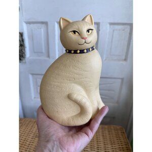 Add a touch of nostalgia to your decor with this charming vintage 80s bisque ceramic set. Featuring a delightful yellow cat figurine and matching trinket box, ideal for cat lovers and collectors. The figurine measures 8" tall and 5" and the box measures 5" tall and 3.5" wide. Both pieces are in good condition and have no chips or cracks.