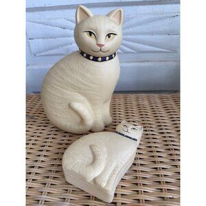Vintage 80s Bisque Ceramic Set Yellow Cat Figurine and Trinket Box