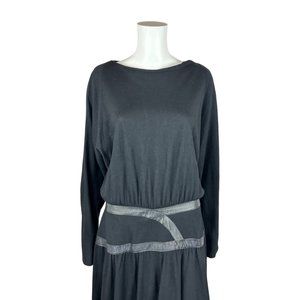 Vintage 80s Black Dress Women's Large Faux Leather Trim Waist Batwing Sleeves Boatneck