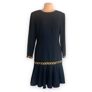 Vintage 80s Black Drop Waist Dress Gold Chain Trim Long Sleeve Crewneck Medium
