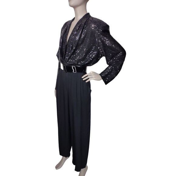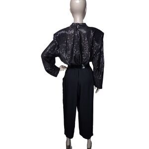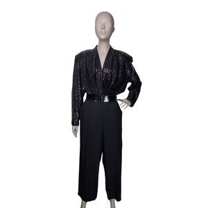 Gorgeous vintage black jumpsuit, top is sequined, draped deep v-neck, shoulder pads gives the high-shoulder look that is currently trending. Pants have pleated front, pockets, has original patent belt, no size/material tag fits a modern S/M/L/XL depending on your measurements and desired fit.