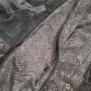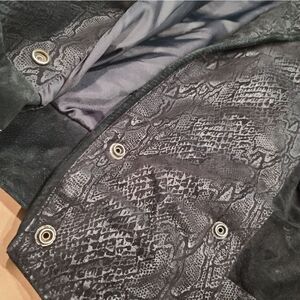 Preston & York black leather coat with snake skin print trim and collar! Has 2 front pockets and adjustable snap button closure and adjustable snaps on the back!
