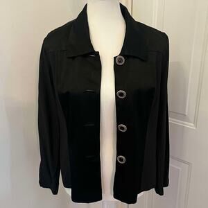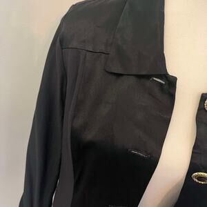 Has mixed fabric. Front part is a satin fabric. Features large gold and black buttons and shoulder pads. Would fit a size small.