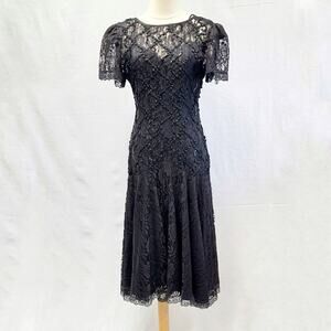 Vintage 80s Black Sequin & Illusion Lace Goth Party Dress Drop Waist size 6