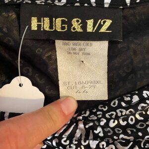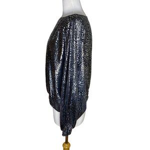 Vintage 80s Hug & 1/2 Black and Silver Metallic Animal Print Blouse flaunts a chic boat neck, long, puff sleeves and an elastic hemline. Size 44 EU. Excellent pre-owned condition.
