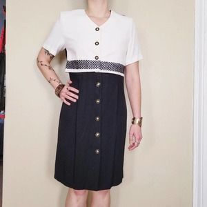 This stylish 80s does 60s button-up dress is only for the classiest of the classy. Gorgeous black & gold buttons line the front along with the textured checkered pattern near the waist. Perfect everyday wear for our dress lovers out there. Ties in the back to synch, made in U.S.A., sewn in shoulder pads