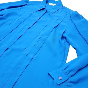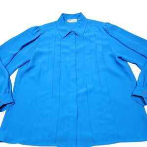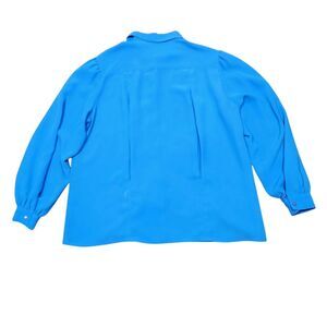 Vintage 80s Blouse Blue Satin Pleated Puffed Shoulder Button Up Long Sleeve 18