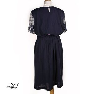 * Special Feature: This vintage dark blue dress has padded shoulders, elastic waist, lace sleeves. The fabric has a subtle stripe pattern.