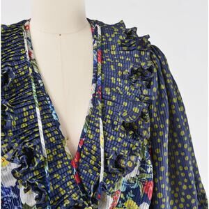 Vintage 80s Blue Floral Ruffle Neck Balloon Sleeve Pleated Midi Dress size S M