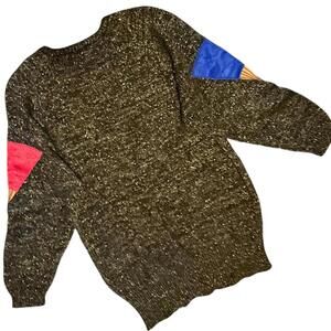 A rare late 80s Bonnie Boerer sweater featuring metallic black knit and bold colorful fan appliqué. Oversized fit, made in Macau, collectible and unique. Perfect for vintage lovers and statement style collectors.