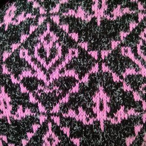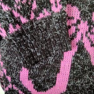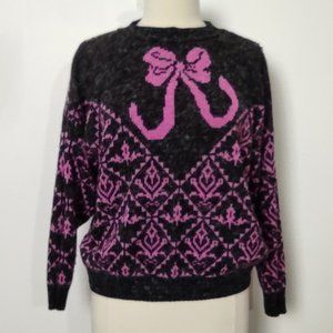 Vintage 80s Bow Print Sweater Crew Neck Marled Fuzzy Knit Pink Grey Medium