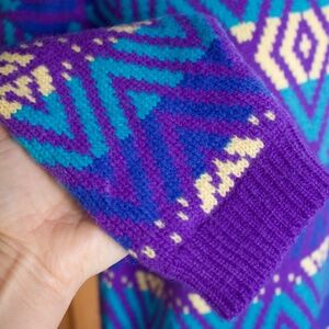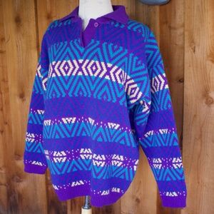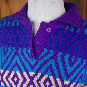 I would say unisex in nature, would look killer on either a man or woman. Great condition, no sign of wear. Thick 100% shetland wool knitted oversized pullover sweater. Collar with single button, essential for ski season. Blue, purple, yellow, & teal oh my! Bold all-over diamond pattern throughout. Size states L, mannequin is a small/medium female build; I'm happy to supply measurements if need be.