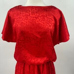 Vintage 80s Brocade Dress Embossed Floral Pattern Blouson Pleated Red