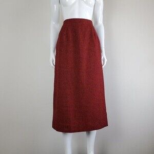 Vintage 80's Brooks Brothers red and black houndstooth pencil midi skirt. High-waisted with 2 front pockets, 2 button/zipper closure in back, back kickpleat, and inner lining.