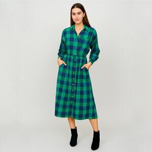 Featuring a classic green and blue check pattern, this button-down dress has a collared neckline, long sleeves with button cuffs, and an elastic waist for a flattering fit. The full midi length makes it perfect for layering with boots or sneakers for a casual yet timeless look.