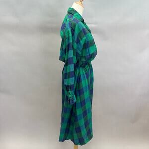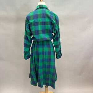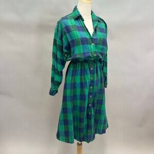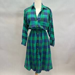 Vintage 80s Buffalo Plaid Flannel Shirt Dress Green Blue Check Button Up Size 8