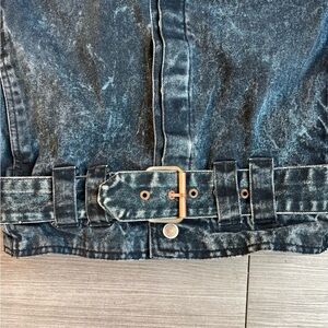 Vintage 80s Bugle Boy Black Acid Wash Distressed Denim Belted Jacket Size L