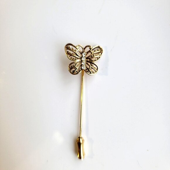 This delicate vintage stick pin features an intricate butterfly design adorned with shimmering rhinestones. A timeless accessory offering subtle elegance.