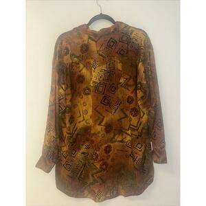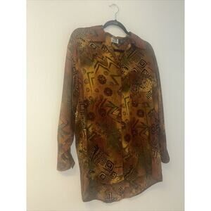 This is a vintage 80's button-down shirt by Paul et Duffier in size medium. The shirt features an abstract Aztech print in brown on rayon fabric. It has a collared neckline with a button-down closure, long sleeves, and a regular fit. The design includes accents of buttons and is inspired by art, retro, and abstract themes. The shirt is lightweight, easy to care for, and a limited edition piece with contrasting trim.